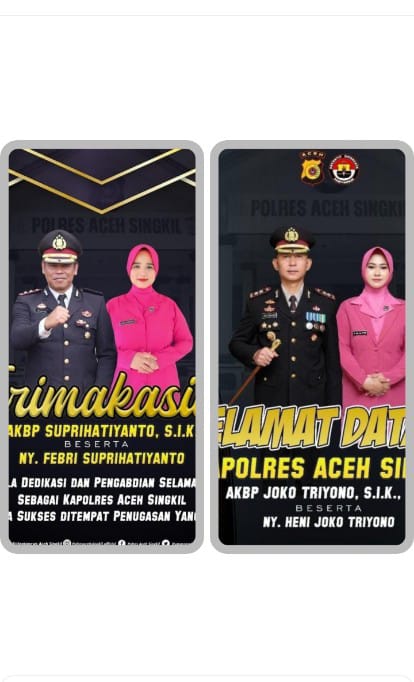 Aceh Singkil mengirimkan ucapan selamat bertugas kepada AKBP. Suprihatiyanto, S.I.K., di jabatan barunya dan menyambut hangat kehadiran AKBP. Joko Triono, S.I.K., MH. sebagai Kapolres Aceh Singkil. Semoga dedikasi keduanya memberikan manfaat yang besar bagi institusi Polri dan masyarakat.[]