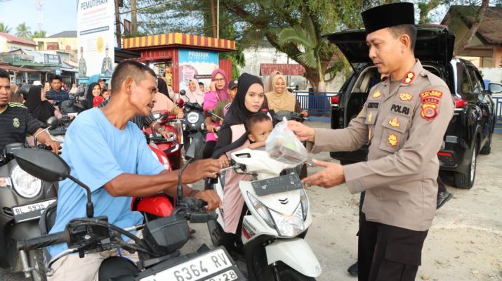 Aceh Singkil, wartapolri.com ~ Dalam rangka menyemarakkan bulan suci Ramadhan 1447 H, Kapolres Aceh Singkil bersama Ketua Bhayangkari Cabang Aceh Singkil melaksanakan kegiatan pembagian takjil gratis kepada masyarakat, Jumat sore, Jumat (20/02/2026) Di Kecamatan Gunung Meriah.